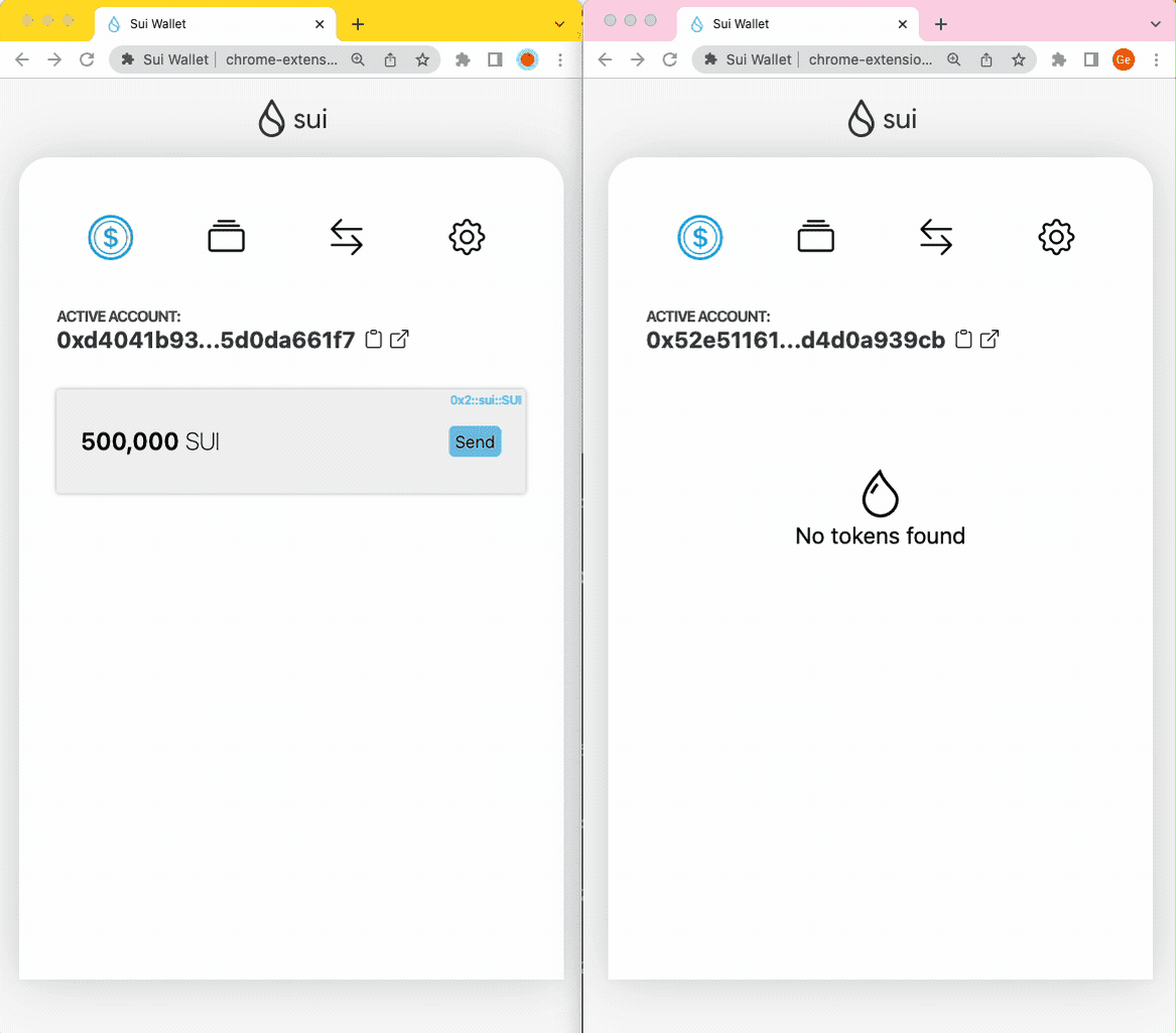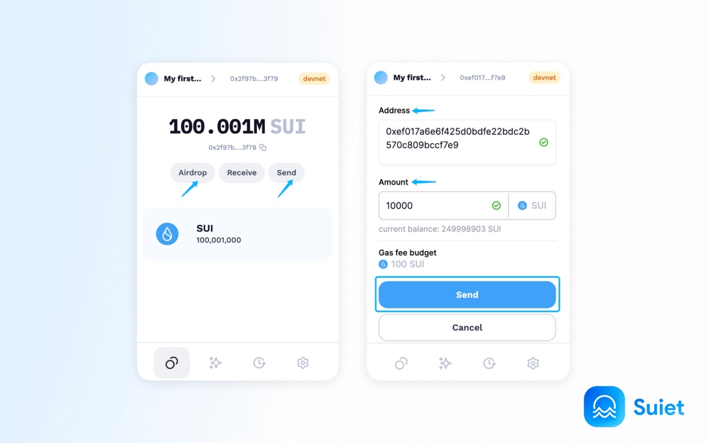 To send SUI tokens, click “Send” on the homepage. Fill in the address and amount of SUI tokens you would like to send, double check before you click that blue send bar.