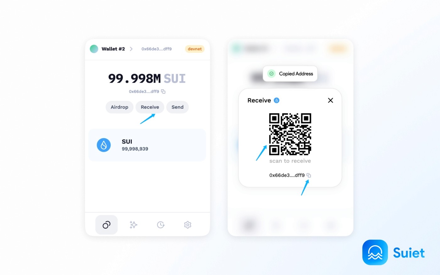Click the “Receive” button, and you will get your QR code and address. Scan the QR code or click to copy your address and pass it to the sender, and you will be notified when you receive the tokens.
