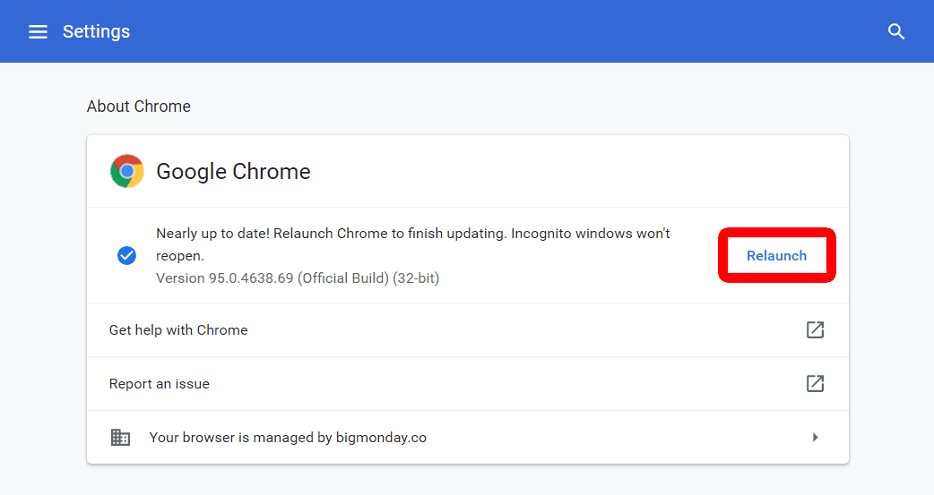 If you are not using the latest Chrome Browser, you will see the "Relaunch" button, then click it